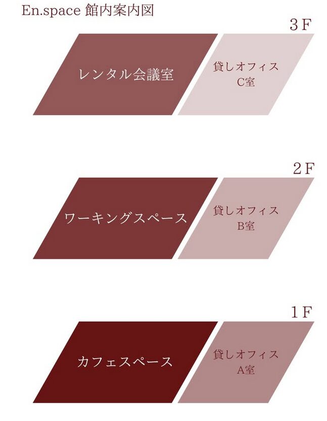 | 貸しオフィス(個室) | 1F A室 68,200円/月 2F B室 46,970円/月 3F C室 68,200円/月 | |